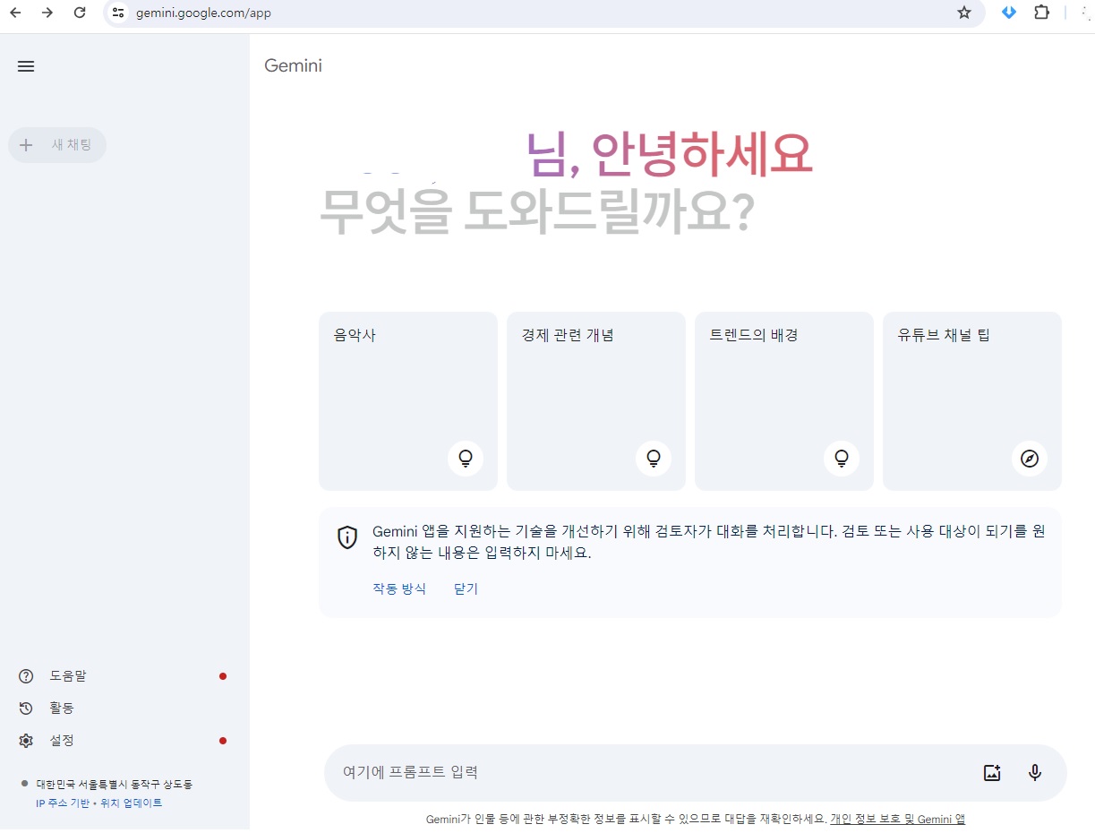 첫 화면입니다. 여기서 왼쪽 파란 아이콘 Gemini와 채팅하기를 누르세요. 그럼 아래 화면이 나타나고 더보기를 누르고